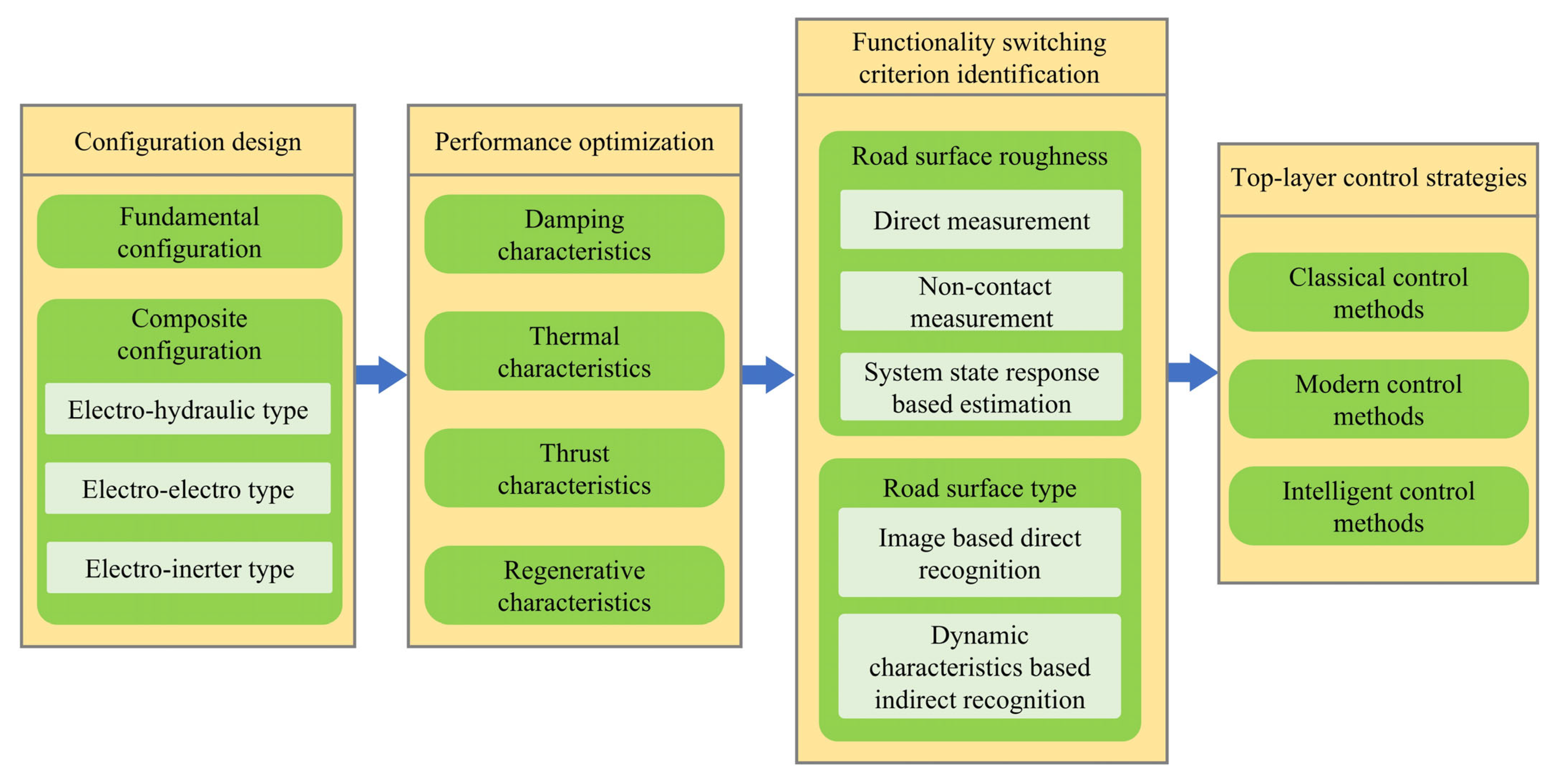 - Learning-Based Adaptive Strategies: With the advancement of onboard processing power, data-driven learning algorithms are emerging for more intelligent and predictive switching. These strategies can adapt the switching policy online based on historical performance or driver preferences. Reinforcement Learning (RL) is a promising framework where an agent learns an optimal policy (switching strategy) by maximizing a reward function that balances ride comfort, driving safety, and energy recovery efficiency [201]. Neural network can also be trained to map identified road features and vehicle states directly to the optimal functionality mode [202,203]. Although these methods promise superior performance and adaptability, they require significant computational resources and extensive training data.