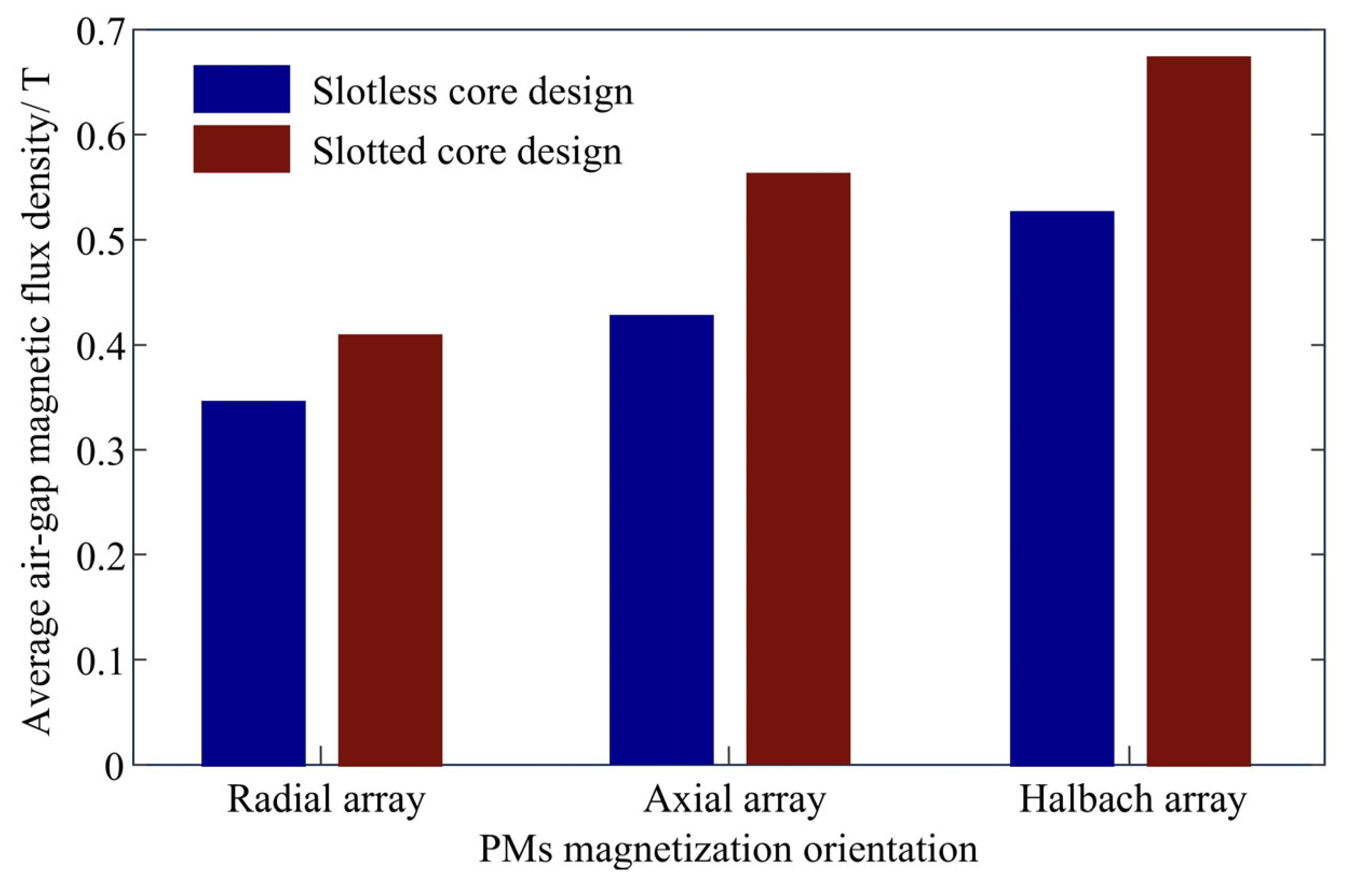 Halbach | Maximum air-gap magnetic flux density | Highest manufacturing complexity, maximal cost, severe thrust ripple | |