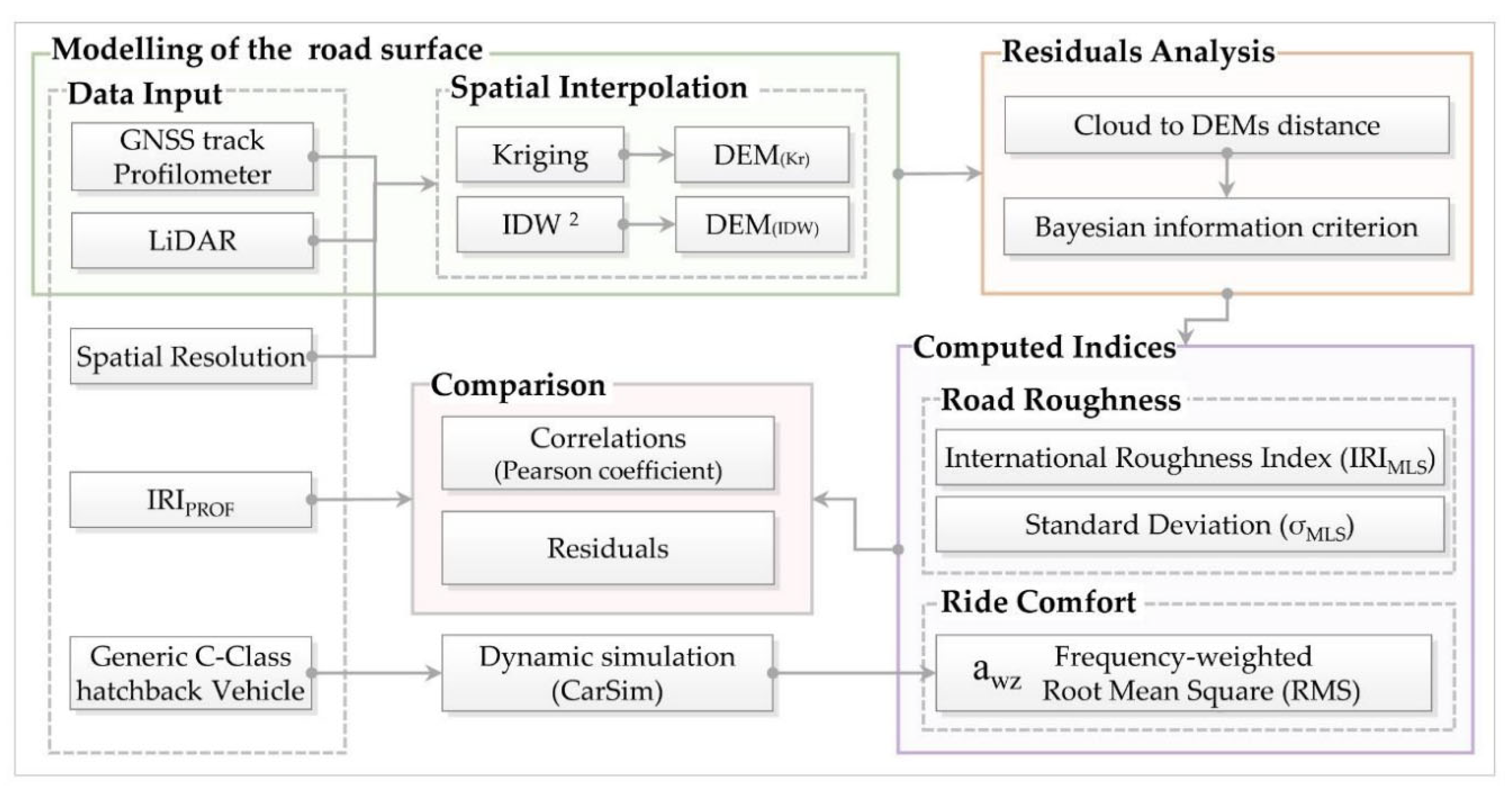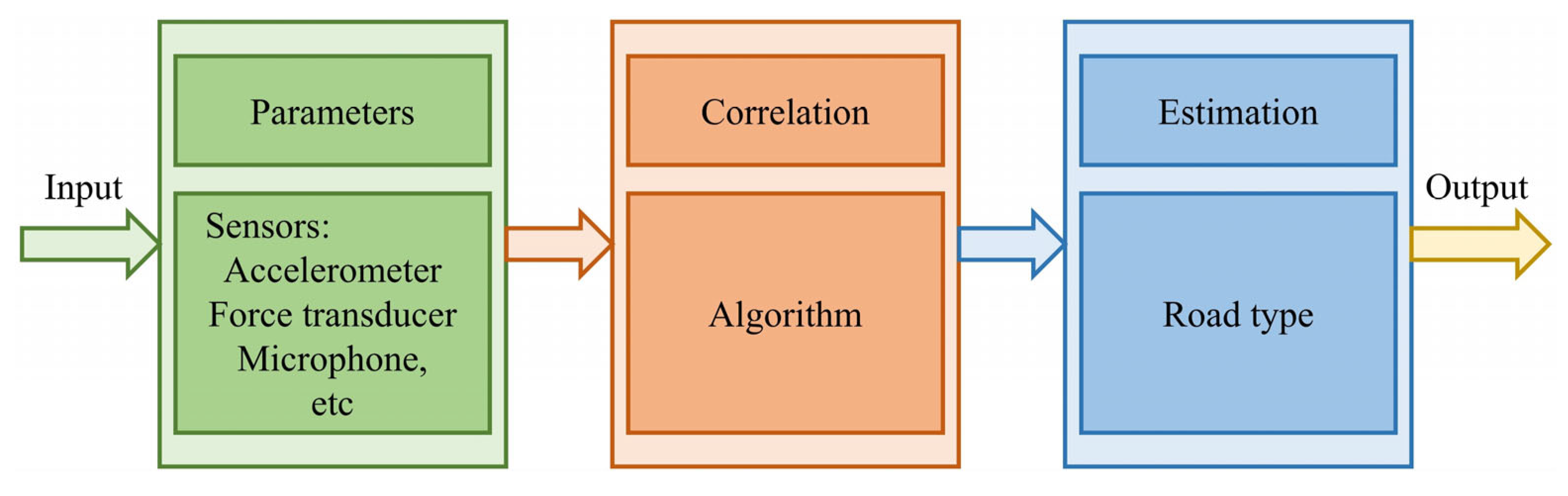 - Regarding the road surface type, it reflects the statistical characteristics of road surface roughness, typically serving as prior knowledge to assist in estimating road surface roughness [152]. The fundamental methods for road surface information identification are summarized in Figure 15. The identification methods of road surface roughness are primarily divided into three categories, namely direct measurement, non-contact measurement, and system state response-based estimation [153,154,155]. And road surface type identification methods are categorized into two main classes, namely image-based direct recognition and vehicle dynamic characteristic-based indirect recognition [156,157].