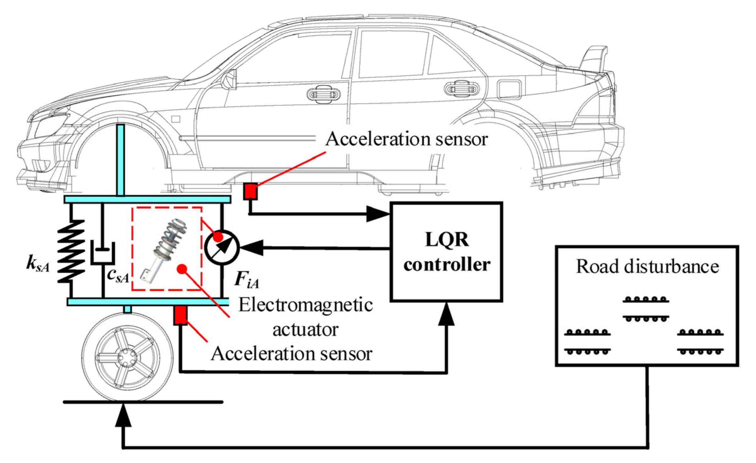 - Sun, F.; Xing, D.Z.; Zhou, R.; Jin, J.J.; Xu, F.C. LQR Control Strategy for Electromagnetic Active Suspension Considering Energy Consumption. J. Southwest Jiaotong Univ. 2023, 58, 754–761. [Google Scholar] [CrossRef]