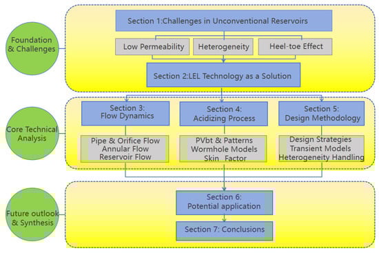 To provide a clear conceptual roadmap of this review, Figure 1 presents a structured flowchart outlining the logical progression and key thematic sections discussed herein. Beginning with the fundamental challenges inherent in unconventional reservoir development—such as ultra-low permeability, pronounced heterogeneity, and the heel–toe effect—the diagram illustrates how Limited-Entry Liner technology emerges as an integrated solution. The core technical review is divided into three pillars: flow dynamics within LEL systems (Section 3), acidizing mechanisms and wormhole modeling (Section 4), and LEL design methodologies (Section 5). Building upon this foundation, Section 6 explores the prospective application of LEL technology beyond hydrocarbon production, specifically envisioning its potential role in carbon sequestration. This review concludes by synthesizing key findings, acknowledging current limitations, and identifying promising future research directions (Section 7).