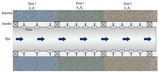 To address these challenges, Coiled Tubing (CT), Inflow Control Device (ICD), and Limited-Entry Liner (LEL) [3,4,15] technologies have been developed. LEL, sometimes called Controlled Acid Jetting (CAJ) or Smart Liner (SL), employs a meticulously designed non-uniform distribution of orifices along the liner. Figure 3 illustrates the general downhole configuration of an LEL system: the entire horizontal wellbore is divided into multiple segments, each equipped with a distinct orifice density, and adjacent segments are hydraulically isolated by mechanical packers. Figure 3 also depicts the acid-flow path during a matrix-acidizing treatment: acid is pumped inside the liner, experiences a pressure drop as it jets through the orifices, enters the annular space between the liner and the formation, and finally invades the reservoir rock to create wormholes.