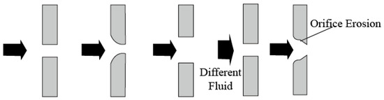 Crump and Conway [24] established foundational insights through systematic laboratory experiments. They designed three sets of experiments (including drilled and shaped-charge orifices) and quantified the increase in from an initial value of 0.56 to over 0.9 due to orifice erosion by pumping slurries of varying concentrations. Their work revealed that erosion rates intensify with higher sand concentrations (>12 lb/gal), smaller initial orifice diameters (<0.3 in), and greater pressure differentials (>500 psi). During LEL operation, the acid continuously erodes the perforation edge, changing its shape and thus the discharge coefficient, as illustrated in Figure 5. Higher sand content reduces flow efficiency through the perforations, increasing pressure drop. This illustrates the direct impact of proppant concentration on perforation performance during fracturing. Additionally, they proposed optimization strategies for limited-entry fracturing designs, such as using larger orifices and dynamically adjusting pumping rates. However, the model’s inability to account for multi-parameter interactions—particularly fluid rheology and proppant size distribution—limited its predictive accuracy in field conditions.