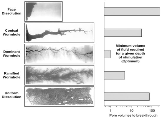 - Buijse, M.A. Understanding Wormholing Mechanisms Can Improve Acid Treatments in Carbonate Formations. SPE Prod. Facil. 2000, 15, 168–175. [Google Scholar] [CrossRef]