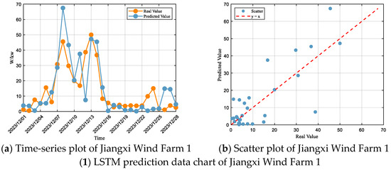 According to the fitting evaluation criteria, the performance of the LSTM model at Jiangxi Wind Farm 1 falls within the “Unsatisfactory” range, with an R2 of 0.48 indicating weak explanatory power. The RMSE and MAE account for 71% and 49% of the standard deviation, respectively, which also places the model in the satisfactory range. At Jiangxi Wind Farm 2, the performance is within the “Unsatisfactory” range, with an R2 of only 0.43, while the RMSE and MAE represent 74% and 47% of the standard deviation, respectively, thereby positioning the model in the “Unsatisfactory” range. At Jiangxi Wind Farm 3, the performance is also “Unsatisfactory”, with an R2 of merely 0.40, and the RMSE and MAE accounting for 76% and 77% of the standard deviation, respectively, which again classifies the model as “Unsatisfactory”. At Jiangxi Wind Farm 4, the performance remains in the “Unsatisfactory” range, with an R2 of only 0.37, while the RMSE and MAE account for 78% and 65% of the standard deviation, respectively, thereby also categorizing the model as “Unsatisfactory”.
