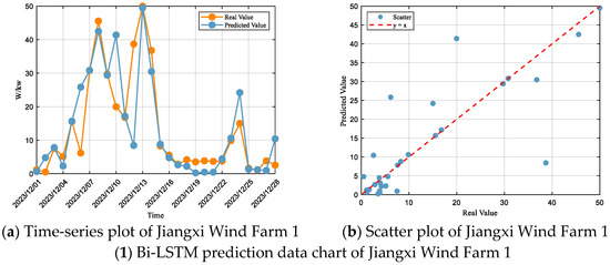 According to the model fit evaluation criteria, the performance of the Bi-LSTM model at Jiangxi Wind Farm 1 falls within the “Satisfactory” range, with an R2 of 0.65, and RMSE and MAE accounting for 58% and 31% of the standard deviation, respectively. At Jiangxi Wind Farm 2, the model performance is also within the “Satisfactory” range, with an R2 of 0.71, and RMSE and MAE accounting for 53% and 34% of the standard deviation, respectively. For Jiangxi Wind Farm 3, the performance remains in the “Satisfactory” range, with an R2 of 0.68, and RMSE and MAE accounting for 55% and 45% of the standard deviation, respectively. At Jiangxi Wind Farm 4, the model similarly achieves “Satisfactory” performance, with an R2 of 0.61, and RMSE and MAE accounting for 61% and 49% of the standard deviation, respectively.