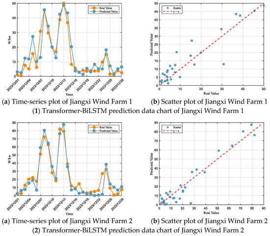 According to the model evaluation criteria, the Transformer-BiLSTM model demonstrates “Great” performance at Jiangxi Wind Farm 1, with an R2 of 0.84, and RMSE and MAE accounting for 39% and 28% of the standard deviation, respectively, placing the model within the “Great” range. At Jiangxi Wind Farm 2, the performance is also rated as “Great,” with an R2 of 0.90, and RMSE and MAE representing 31% and 24% of the standard deviation, respectively. For Jiangxi Wind Farm 3, the model shows “Great” performance in terms of R2 (0.84), while RMSE and MAE account for 40% and 34% of the standard deviation, placing it within the “Satisfactory” range. At Jiangxi Wind Farm 4, the model achieves “Great” performance, with an R2 of 0.82, and RMSE and MAE corresponding to 41% and 31% of the standard deviation, respectively.