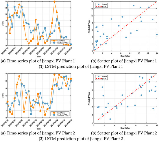 According to the goodness-of-fit evaluation criteria, the LSTM model’s performance for Jiangxi PV Plant 1 falls within the “Unsatisfactory” range, with an R2 of 0.38, and RMSE and MAE accounting for 76% and 62% of the standard deviation, respectively, placing the model in the “Unsatisfactory” category. For Jiangxi PV Plant 2, the performance is also “Unsatisfactory”, with an R2 of 0.40, and RMSE and MAE accounting for 76% and 55% of the standard deviation. Jiangxi PV Plant 3 exhibits “Unsatisfactory” performance as well, with an R2 of 0.30, and RMSE and MAE accounting for 82% and 68% of the standard deviation. Finally, for Jiangxi PV Plant 4, the model’s performance remains “Unsatisfactory”, with an R2 of 0.34, and RMSE and MAE accounting for 80% and 68% of the standard deviation.