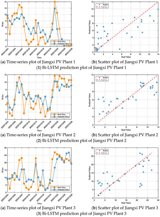 According to the fitting evaluation criteria, the Bi-LSTM model performs within the “Satisfactory” range at Jiangxi PV Plant 1, with an R2 of 0.54, and RMSE and MAE accounting for 66% and 53% of the standard deviation, respectively, which also place the model in the “Satisfactory” range. At Jiangxi PV Plant 2, the performance is also within the “Satisfactory” range, with an R2 of 0.63, and RMSE and MAE corresponding to 60% and 46% of the standard deviation, respectively, thus meeting the satisfactory standard. At Jiangxi PV Plant 3, the model’s performance falls into the “Unsatisfactory” range, with an R2 of 0.46, and RMSE and MAE representing 73% and 53% of the standard deviation, respectively, which classify the model as “Unsatisfactory”. At Jiangxi PV Plant 4, the model again performs within the “Satisfactory” range, with an R2 of 0.60, and RMSE and MAE accounting for 62% and 52% of the standard deviation, respectively, thereby also placing the model in the “Satisfactory” range.