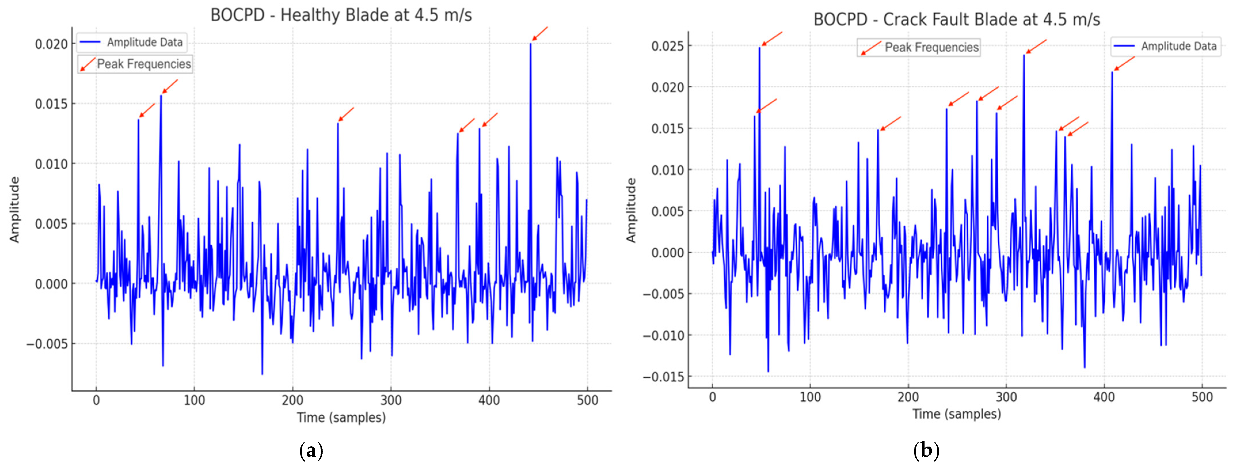 Blade Crack Fault | WT | BOCPD | WT captures the frequency spikes. | BOCPD confirms abrupt changes in vibration trends. | High, may generate false positives in noisy conditions. | Blade Crack | [15,25,26,27,151,221,223,249,250,252] |