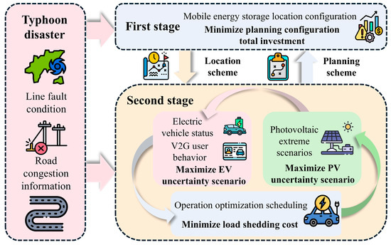 Motivated by the increasing vulnerability of power systems under typhoon conditions, this study proposes a two-stage distributed robust optimization framework that accounts for dual uncertainties arising from both extreme weather events and distributed energy variability. The goal is to enhance system resilience and ensure power supply continuity under compound disaster scenarios. The structure of the proposed model is illustrated in Figure 1 and described in detail below.