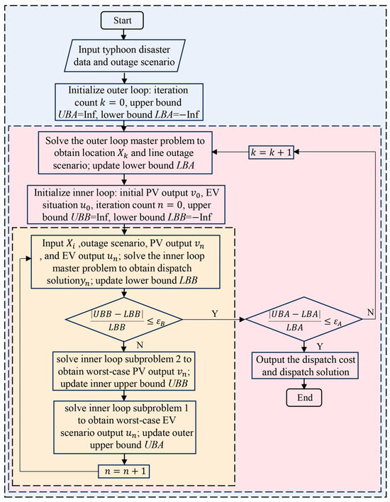 - Step 6: Input the scheduling scheme and the uncertain electric vehicle scenario , solve the inner loop subproblem 2 to find the worst-case photovoltaic output scenario , and update the upper bound of the inner loop