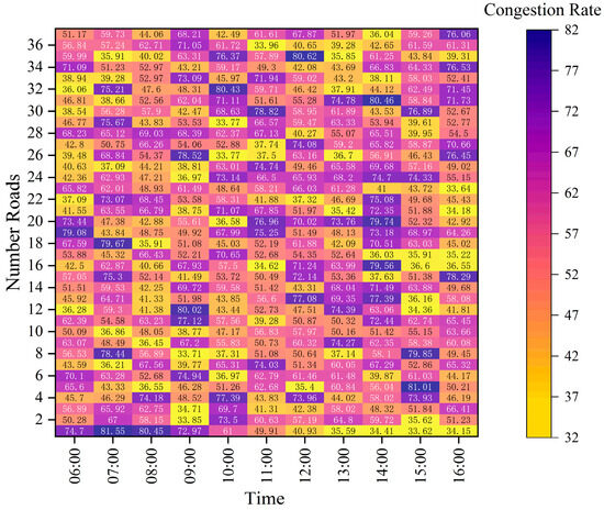 As typhoon disaster evolution modeling is well-established, this paper does not simulate specific disaster progressions. Instead, fault and outage scenarios are derived from historical typhoon data as referenced in [32]. It is assumed that the typhoon disaster scenario begins at 6:00 and ends at 16:00, with a disaster duration of 10 h, and a scheduling prediction time scale of 1 h. The configuration cost of MESS is RMB 500 yuan/kW, and the reward and penalty cost for charging and discharging EVs is RMB 100 yuan/kW. Based on functional differences in load demand, nodes with essential services—such as hospitals, data centers, and municipal infrastructure—are designated as critical nodes, while residential load points are classified as ordinary nodes. To reflect their importance, the penalty cost for load reduction at critical nodes is set to be ten times higher than that at ordinary nodes. Predictions are made based on historical PV output during disaster periods, and road congestion conditions are randomly generated as shown in Figure 4 and Figure 5.