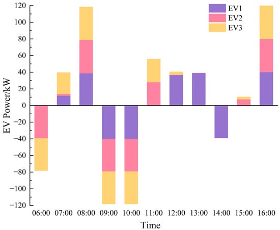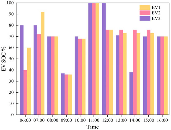 When the battery of an electric vehicle is in good condition, discharging it can better protect battery health. Therefore, the discharge threshold for electric vehicles is set at 70% of the rated capacity. Once the battery level reaches this threshold, users can independently decide on discharge behavior and duration under the discharge incentive mechanism. As shown in Figure 6 and Figure 7, during the 6:00–7:00 time slot, EV1 and EV2 did not reach the discharge threshold and only performed charging, while EV3 users who met the discharge conditions did not choose to discharge; during the 8:00–9:00 time slot, EV3’s discharge power was significantly lower than that of EV1 and EV2. During the 13:00 to 15:00 time slot, EV1 and EV2 did not perform charging or discharging. This reflects realistic EV behavior and underscores how uncertainty in user actions directly affects the grid’s power support capacity.