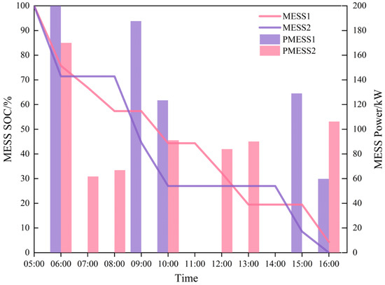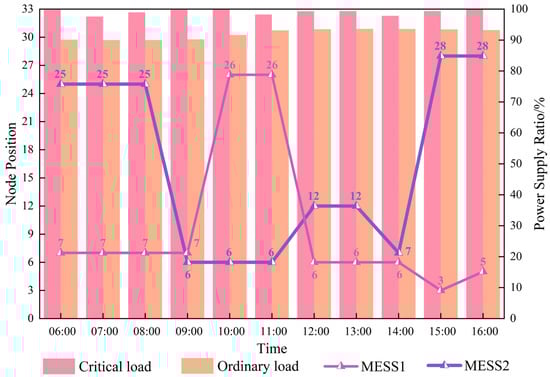 The routing of MESS is dynamically planned and scheduled based on real-time information, with decisions updated on an hourly basis. Constraints include real-time traffic congestion conditions and the number of nodes reachable per unit time. MESS units suspend discharging while en route to target nodes. As shown in Table 3, neither MESS1 nor MESS2 discharged during their movement from node 7 to 26 and from node 25 to 6, respectively—a strategy resulting from the algorithm’s trade-off between travel time and discharging benefits. If the target node cannot be reached within the scheduled time, the system automatically reroutes the MESS to the nearest node in urgent need of power to maximize supply capacity, as exemplified by MESS2’s return strategy during its movement from node 6 to 7. This adaptive retreat strategy in case of unreachable targets reflects the algorithm’s robustness against uncertainties. In scenarios where actual traffic congestion is more severe than predicted or the target node cannot be reached within the scheduled time, the algorithm triggers real-time emergency rescheduling. The immediate objective shifts to maximizing the support capability within the currently accessible range of the MESS, identifying the optimal node for assistance within its reach. During MESS routing and scheduling, power supply priority is given to critical nodes—such as hospitals, data centers, and communication base stations—and their adjacent nodes, followed by ordinary nodes. This prioritization is due to the higher importance of vital loads and their significantly higher penalty costs associated with power interruption. Therefore, both reliability and economic considerations justify prioritizing critical nodes. This decision is explicitly driven by the economic objective function of the model. The algorithm does not simply identify node types; it strictly follows an economic-driven principle. Thus, any scheduling action that reduces load shedding at critical nodes results in cost savings. During the solution process, the algorithm automatically prioritizes dispatching MESS to areas where the largest reduction in total system cost can be achieved. This not only enhances power supply reliability but also minimizes economic loss, directly mapping the optimization objective onto scheduling strategies.