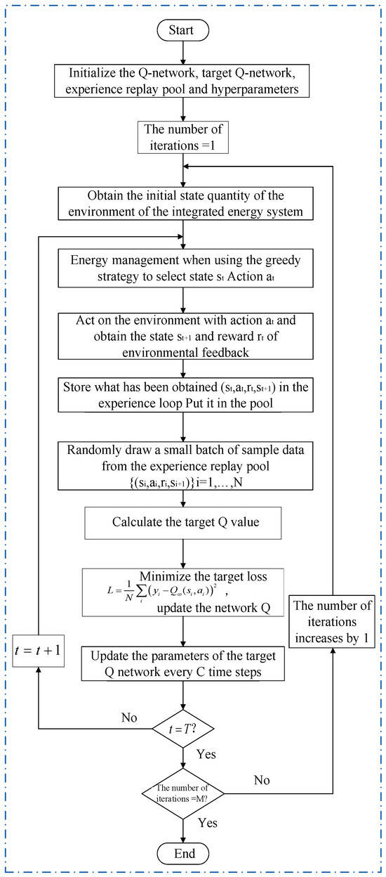 Due to its advantage of model-free learning, the DQN algorithm is highly suitable for the energy optimization management problem of the integrated energy system with uncertain factors required in this paper. The state space in the integrated energy system described in this paper is shown in Equation (21), including the user-side electrical load, heat load, output electrical power of photovoltaic equipment, state of charge of electrical storage, operating time t, and the power interaction power between the system and the main power grid. All of these are continuous and require a very large table to fit the Q function, so traditional reinforcement learning is no longer applicable. The ε-greedy strategy is used for DQN to balance exploration and exploitation in discrete action spaces, while Gaussian noise is added to DDPG actions to encourage exploration in continuous spaces. These strategies are commonly used in DRL to prevent premature convergence to suboptimal policies. Therefore, the DQN algorithm is applicable to the energy optimization management of the integrated energy system required in this paper. However, the DQN algorithm is applicable to discrete action Spaces, while the action Spaces of the system in this paper, as shown in Equation (22), are all continuous action Spaces. Therefore, the action space in the DQN algorithm still needs to be discretized. The energy management method process of the integrated energy system based on the DQN algorithm is shown in Figure 2.