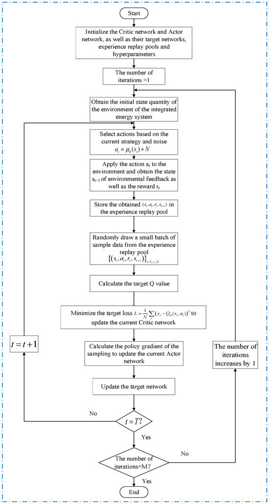 The energy management method of the integrated energy system based on the DQN algorithm has the problem of needing to discretize the continuous action space. The DDPG algorithm combines the idea of deterministic strategies and can handle continuous values in the system action space (output electric power of combined heat and power units, charging/discharging power of electric energy storage, output thermal dynamic rate of gas boilers, and input electric power of electric boilers). Therefore, this paper also simultaneously adopts the DDPG algorithm for the energy optimization management of the integrated energy system. The flowchart of the energy optimization management method for the integrated energy system based on DDPG is shown in Figure 3. It is acknowledged that the DRL-based approach operates as a “black-box” model in terms of explicitly modeling energy consumption patterns. However, this is a deliberate design choice rather than a limitation. The core advantage of DRL is its ability to learn optimal control policies directly from data interactions without relying on explicit mathematical formulations of complex and uncertain consumer behaviors or precise physical models, which are often difficult to obtain accurately in practice.