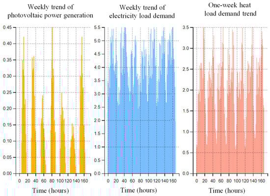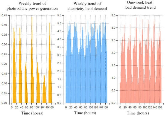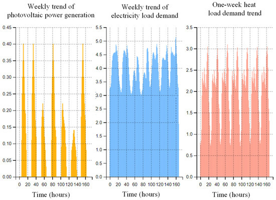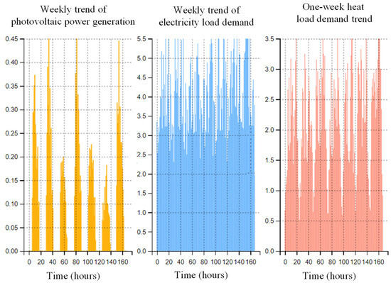 The operating parameters of the components of the integrated energy system are shown in Table 1. The range of the power exchange rate between the system and the main power grid is [0, 8] MW, that is, the system does not sell electricity to the main power grid. The capacity of the electrical energy storage is, and other parameters are shown in Table 2. The electricity price in the integrated energy system adopts time-of-use pricing, where the peak period is , the off-peak period is , and the valley period is . The purchase and sale electricity prices are shown in Table 3. The purchase price of natural gas is fixed at 400 yuan/(MW·h). The power generation capacity of photovoltaic equipment within one week, as well as the demands for electrical load and heat load, are shown in Figure 4.