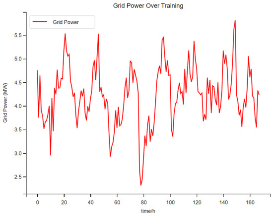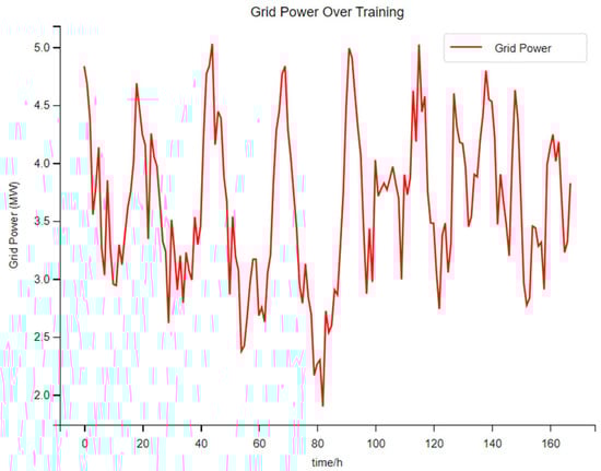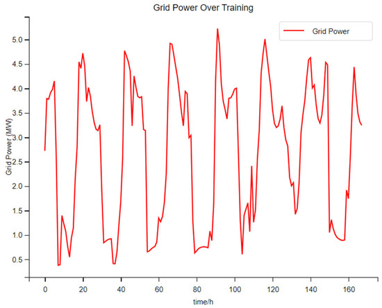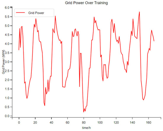 In Figure 9, when the photovoltaic penetration rate is 20%, the electrical power in the early stage of training will fluctuate greatly, with poor stability. Occasionally, there will be a sudden change in electrical power. The peak is generally around 4.5 MW–5.0 MW, and the valley is generally around 2.5 MW–3.0 MW. The amplitude fluctuation of the electrical power in the later stage of training becomes visibly smaller with good stability, and the peak is generally around 4.0 MW to 4.5 MW. Moreover, the trough of electric power usually occurs during the off-peak period of electricity prices, while the peak usually occurs during the peak period of electricity prices. At this point, the switching power between the system and the main grid is still normal. Compared with the normal situation, it has changed slightly.