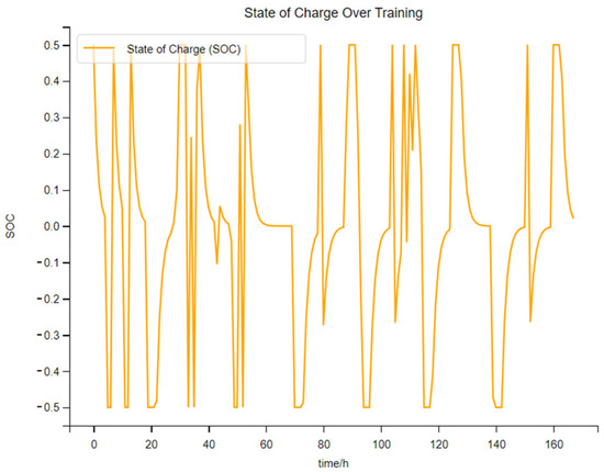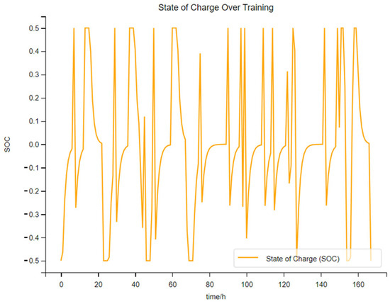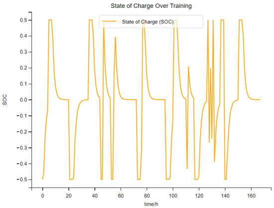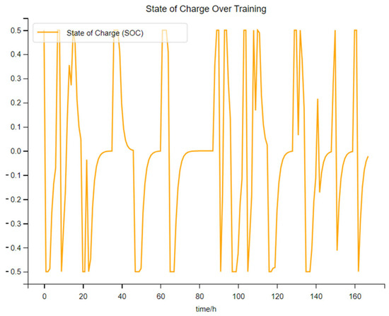 As shown in Figure 14, this figure is the charging and discharging power diagram of electrical energy storage when the photovoltaic penetration rate is 50%. As can be seen from the figure, the charging frequency of the electrical energy storage equipment has further decreased. There are sharp changes in the charging and discharging power in both the initial and later stages of training. However, overall, it still shows that the electrical energy storage is undergoing optimized management. Therefore, at this point, the role of the DDPG algorithm in the energy optimization management of the integrated energy system is significantly reduced, but it still has an effect.