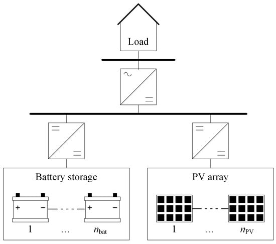 The input data required, electricity consumption, and solar irradiation are explained in the previous section. The results of the sizing procedure are the number of PV modules, the number of batteries, the battery technology, and the final LOLP value obtained with the optimal configuration of PV modules and batteries. The size of power converters is not investigated in this work, but DC-DC converters are required to connect the PV array and battery storage (BS) to the same DC bus, and a DC-AC converter is required to connect the PV array and BS with the electricity consumer.