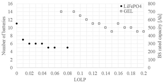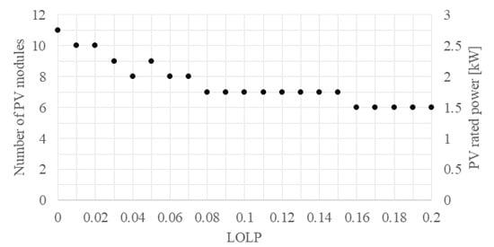 To cover electricity demand during the entire simulation period, 11 PV modules (Figure 5) and 11 LiFePO4 batteries (Figure 6) are required. Increasing the initial LOLP to 0.01 reduces the requirement to 10 PV modules and 7 LiFePO4 batteries, which is 4 batteries fewer than when LOLP = 0. With further increases in the initial LOLP, the number of required components generally decreases, although there are exceptions. When the initial LOLP is 0.04, eight PV modules and six LiFePO4 batteries are required, and when the initial LOLP is 0.05, nine PV modules and five LiFePO4 batteries are required, because the cost of an additional PV module is lower than the cost of one LiFePO4 battery. For initial LOLP values between 0.08 and 0.15, seven PV modules are required, while for values between 0.16 and 0.20, six PV modules are sufficient. The number of batteries decreases to 9 at at LOLP = 0.15, but then increases again to 11 at LOLP = 0.16, because the cost of 2 gel batteries is lower than that of 1 PV module. A high-performance LiFePO4 battery is the optimal battery type at LOLP values up to 0.08, with the exception of an LOLP value of 0.07, when the gel battery is the optimal solution. At LOLP values above 0.08, a gel battery with lower performance, but also with a much lower price, is a more suitable battery type.