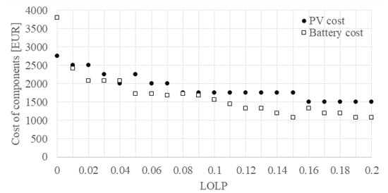 The individual costs of PV modules and batteries are presented in Figure 9, while the total cost of the system is presented in Figure 10. With an increase in the LOLP value, the cost of individual components and the total cost of the system decreases, which is expected due to there being fewer PV modules and batteries. The total cost of the system for the case of an LOLP equal to 0 is EUR 6552, according to Figure 10. The cost of batteries is EUR 3802, which is significantly higher than the cost of PV modules, which is equal to EUR 2750, according to Figure 9.