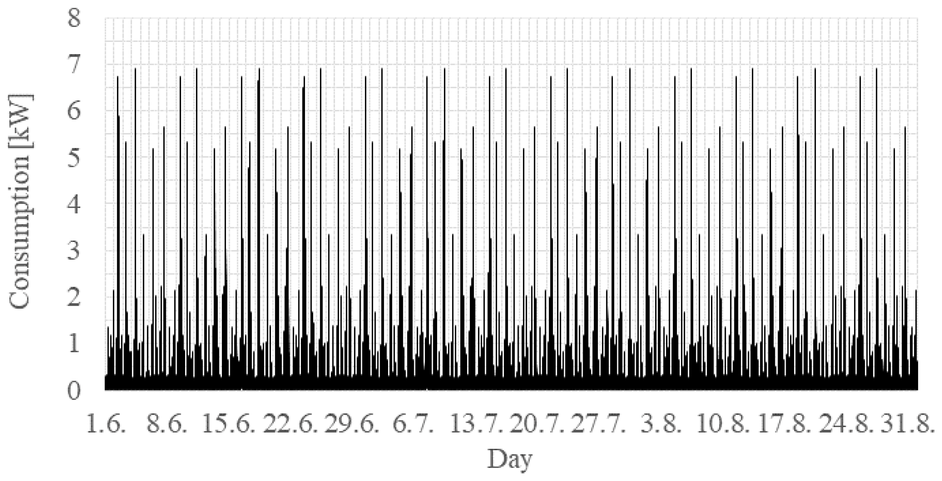 Figure 1. Due to the unavailability of 1 min electricity consumption data, the load profile was generated from measured 10 min data using a uniform distribution. The mean value is equal to the measured average 10 min value, and the uniform distribution range is ±100% of the average 10 min value.