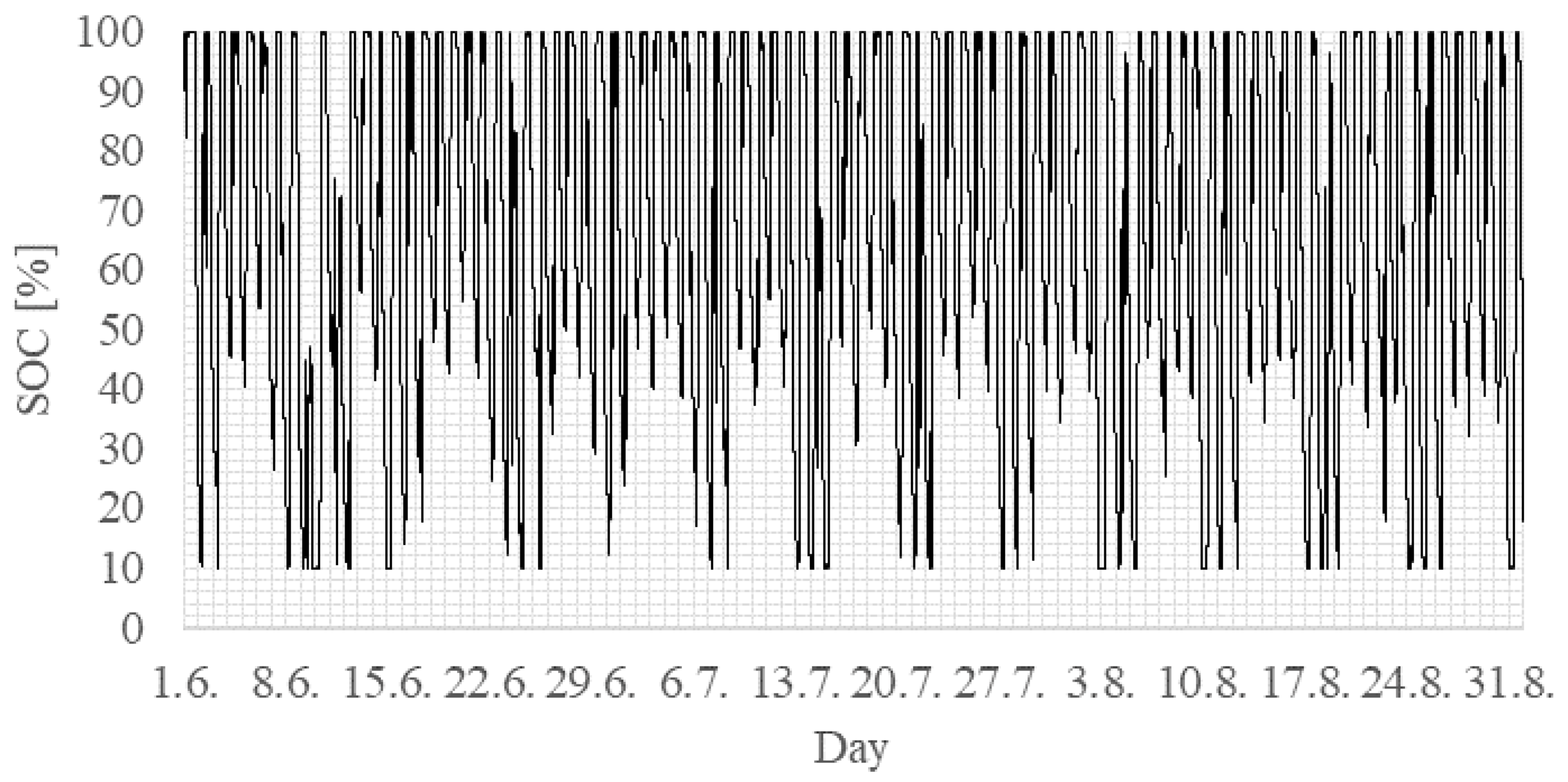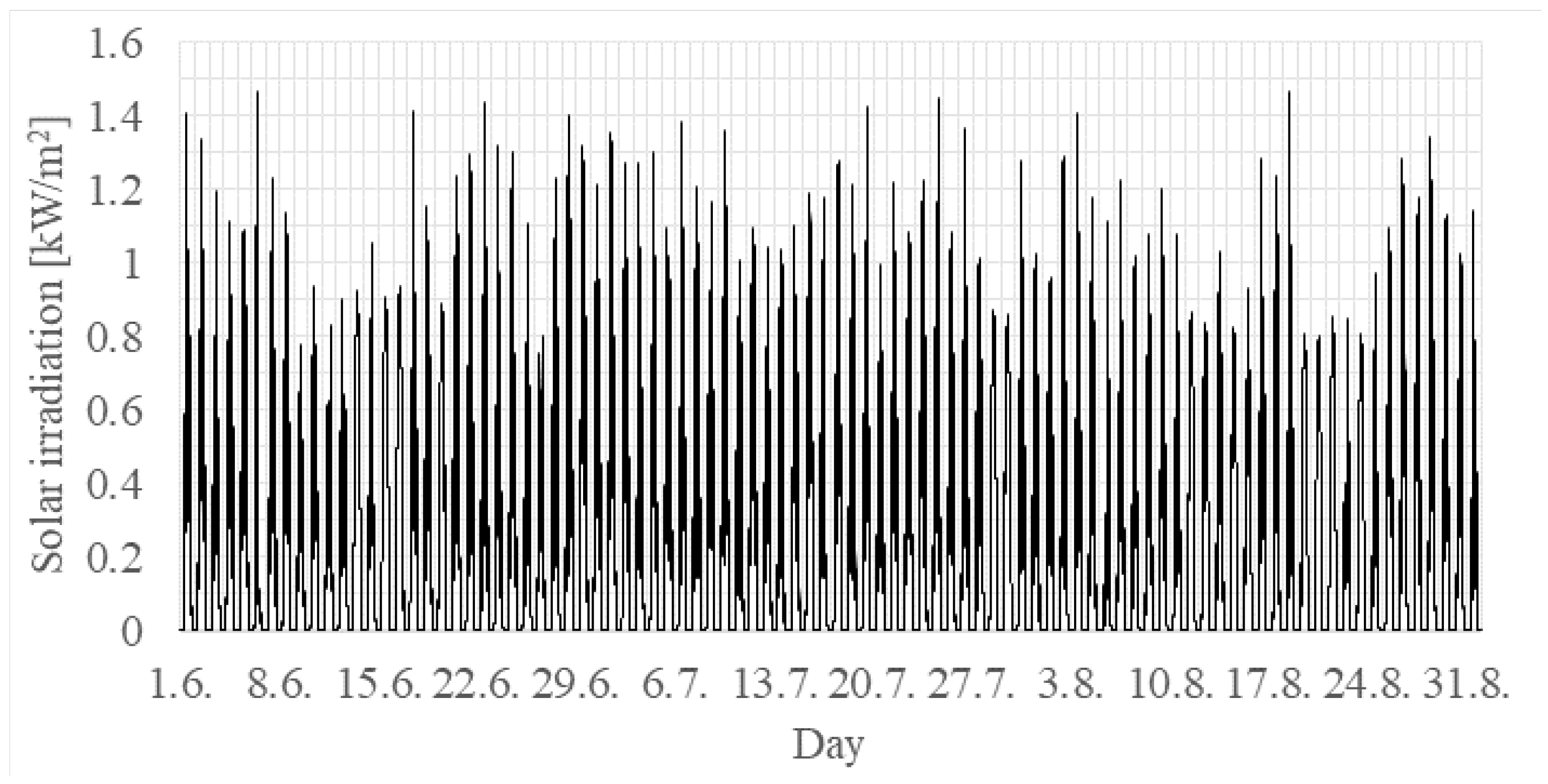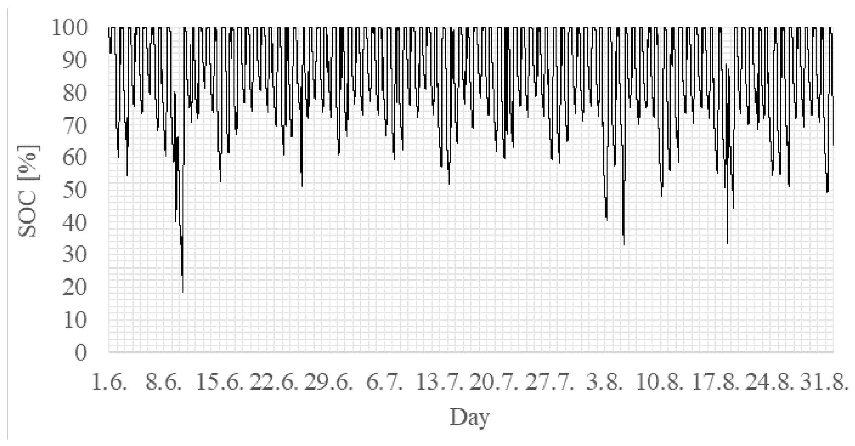 The proposed algorithm can be applied to different optimization periods. Optimization can be performed throughout the year, but it is less likely to use the off-grid PV system to meet electricity consumption in properties used for the entire year, due to the high installed PV power and BS capacity required to provide enough electricity in winter months if the electricity grid is available. Off-grid PV systems are more likely to be used for properties used for several months during a year, usually during the summer months, when the lower installed PV power and BS capacity are enough to cover the electricity consumption. In this paper, an algorithm is applied to an off-grid PV system used to cover load demand in cottages used during the three summer months, from 1 June to 31 August, respectively. The period for which the simulation is performed is 92 days.