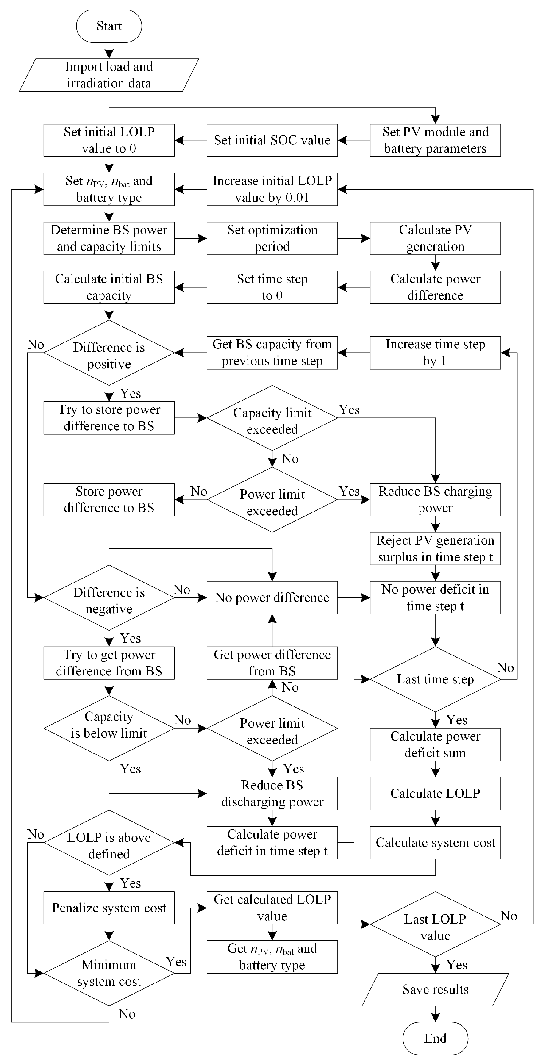 Two requirements must be met. The first requirement is that the final LOLP achieved must be less than or equal to the defined initial LOLP. If the final LOLP is higher than the initial LOLP defined, the system cost is penalized, and this combination of PV modules and batteries is rejected as a solution. The second requirement is the minimum cost with a selected combination of PV modules and batteries. If the system cost is not minimal, the algorithm sets new combinations until the minimum system cost is achieved.