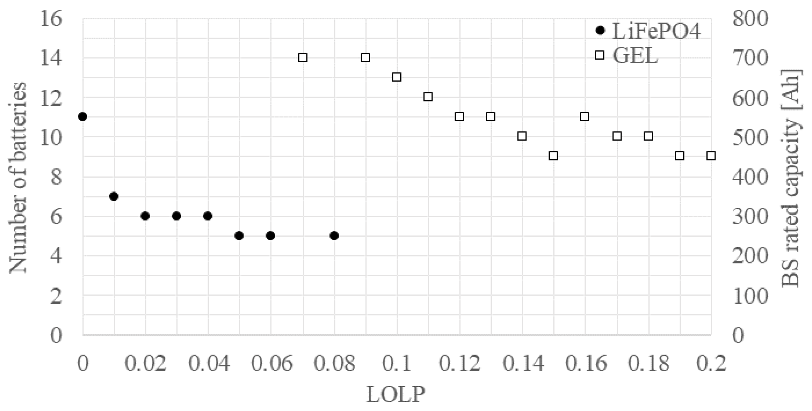 18], present a model for sizing a hybrid off-grid PV–wind–battery system, considering LOLP, using MATLAB software. LOLPs from 0 to 10% were considered, and based on the results, the system proved to be most profitable with 3% LOLP. In [