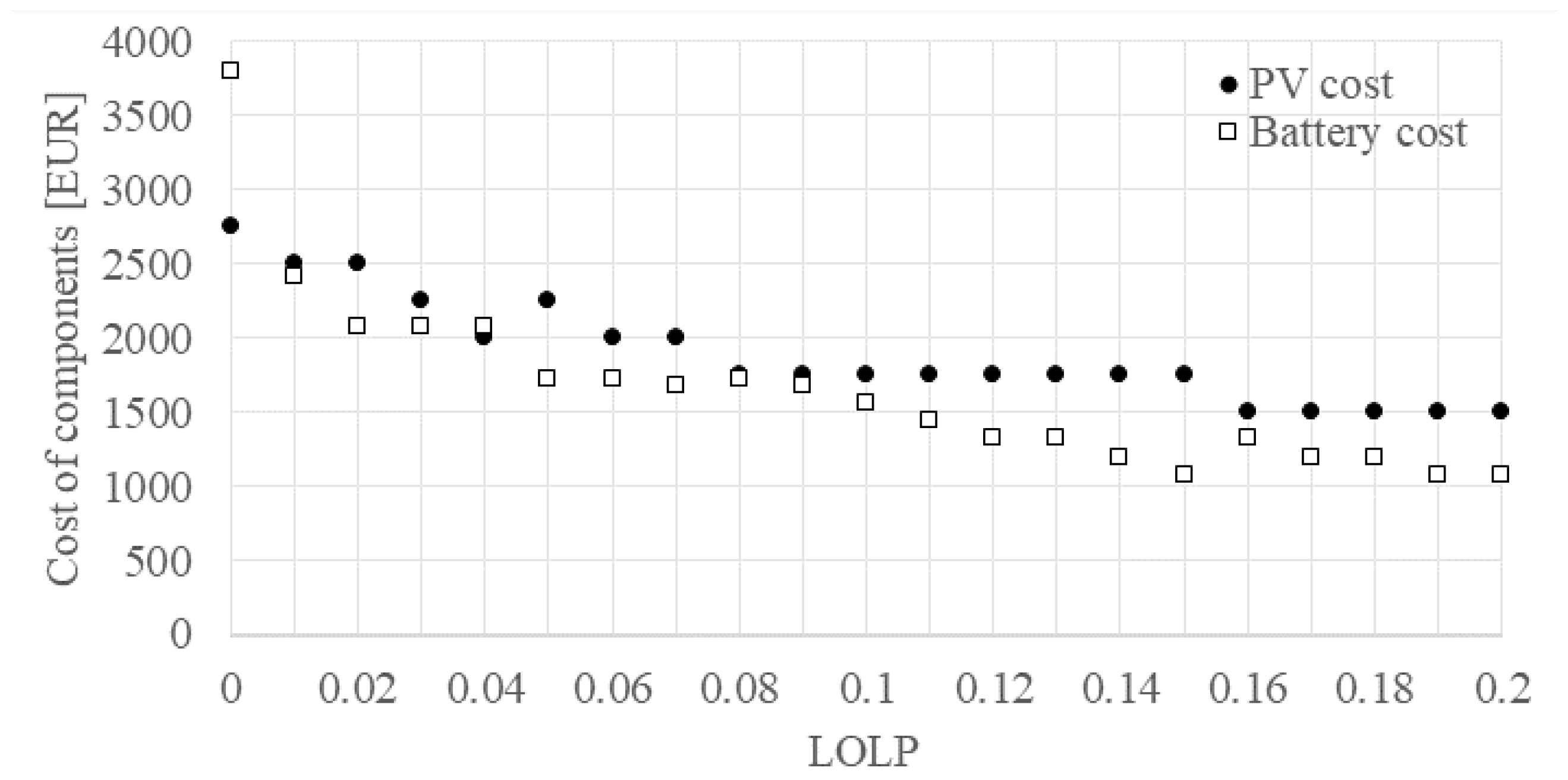 The cost of PV modules and batteries varies depending on the availability of products from different manufacturers on the local market. It should also be noted that component costs change over time, and there is an expected decrease in the future. However, since this work investigates the impact of the LOLP value on the number of components and the system cost, a trend of decreasing system cost with increasing LOLP is expected, regardless of the initial component cost.