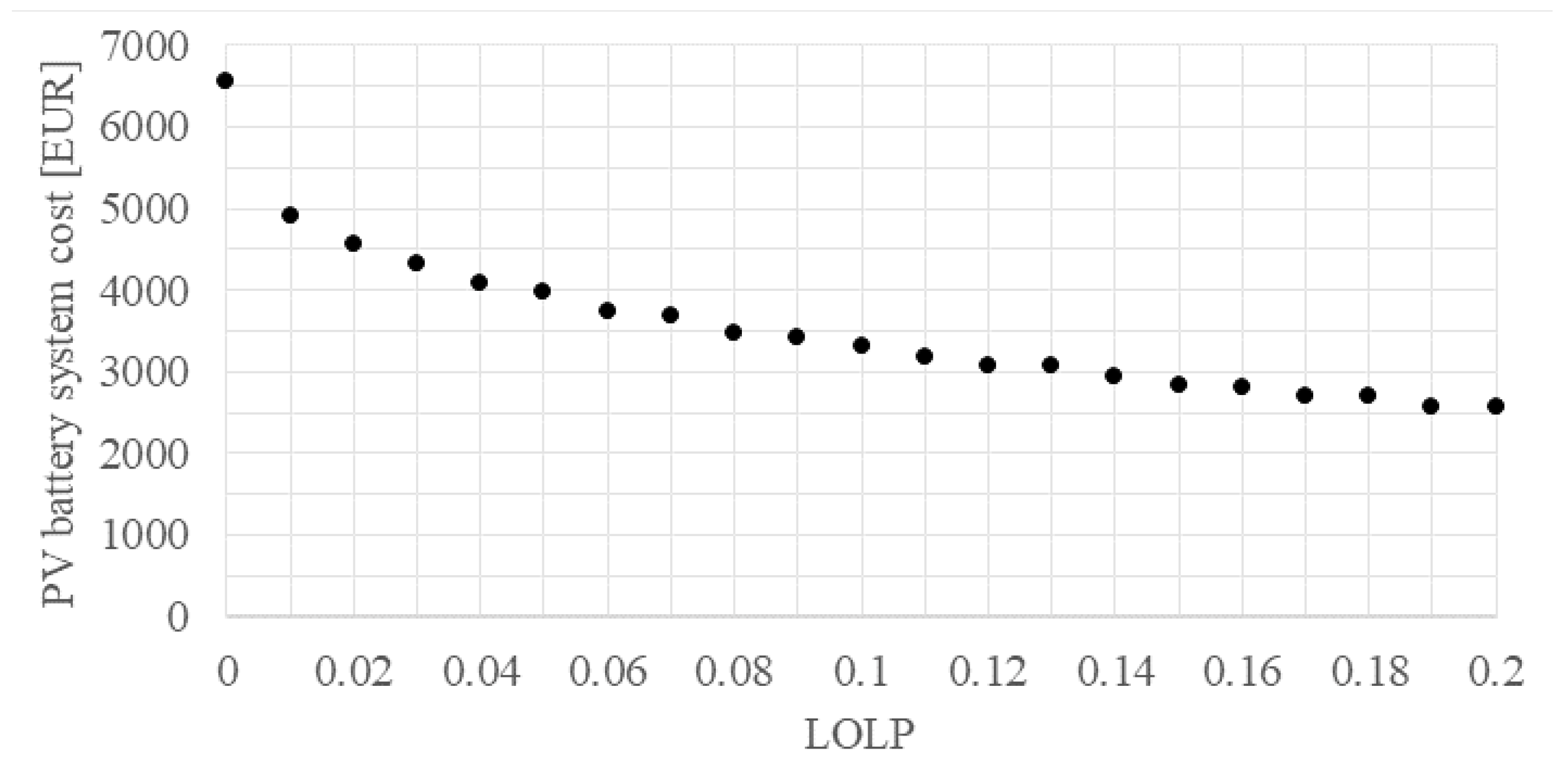 Grid-connected PV systems, without or with a battery, can cover a power deficit with electricity from the main grid to ensure that a sufficient power supply is available at all times. Off-grid PV systems require a battery to store excess PV generation and ensure power supply when PV generation is not available. Installing enough PV power and battery capacity to meet the electricity consumption of all electrical devices at all times leads to high investment costs, which can be reduced if part of the consumption is not covered. Users can decide what percentage of load demand can be lost without a loss of comfort. LOLP, in this work, is defined as the relationship between the total power deficit and the total load demand during the observed period. In this paper, the maximum LOLP is 20%, and optimization is performed for LOLP values in the range of 0 to 20%, with 1% steps.