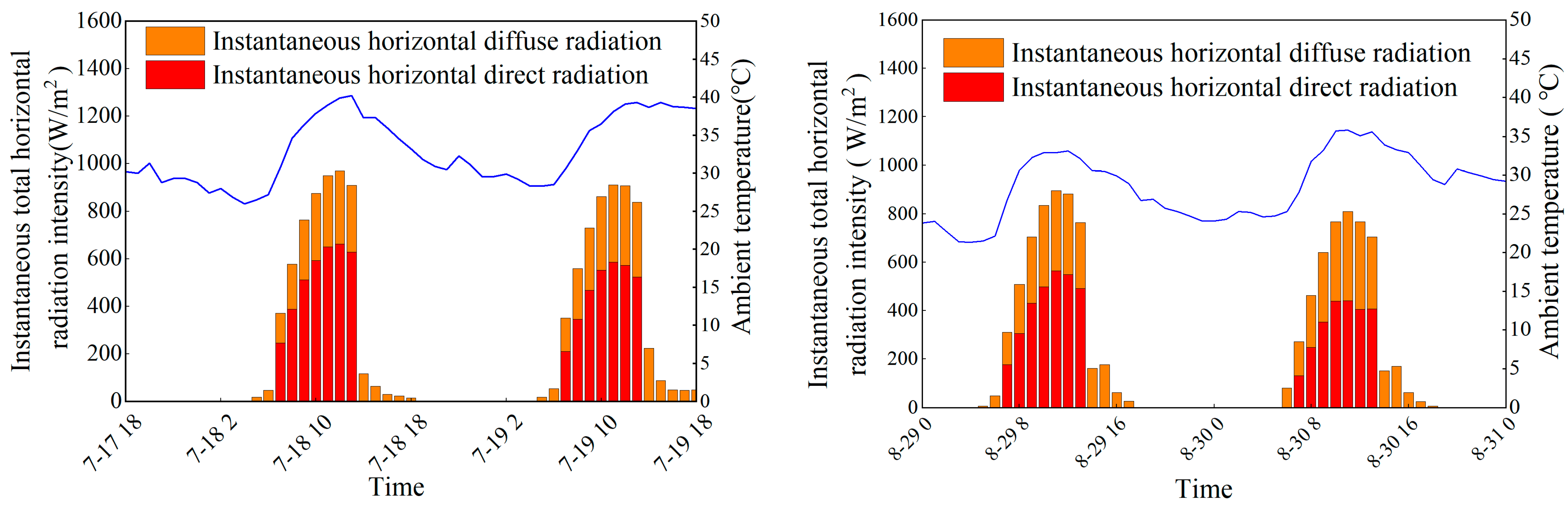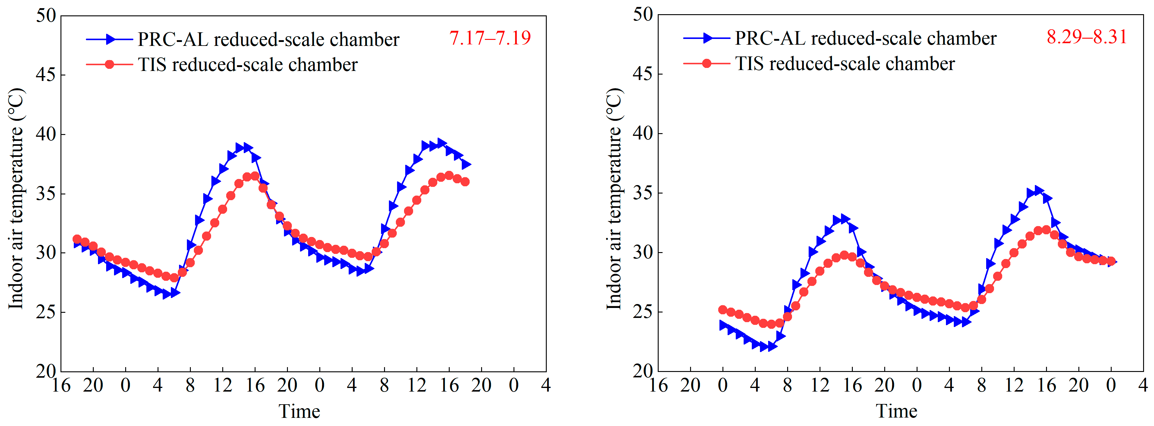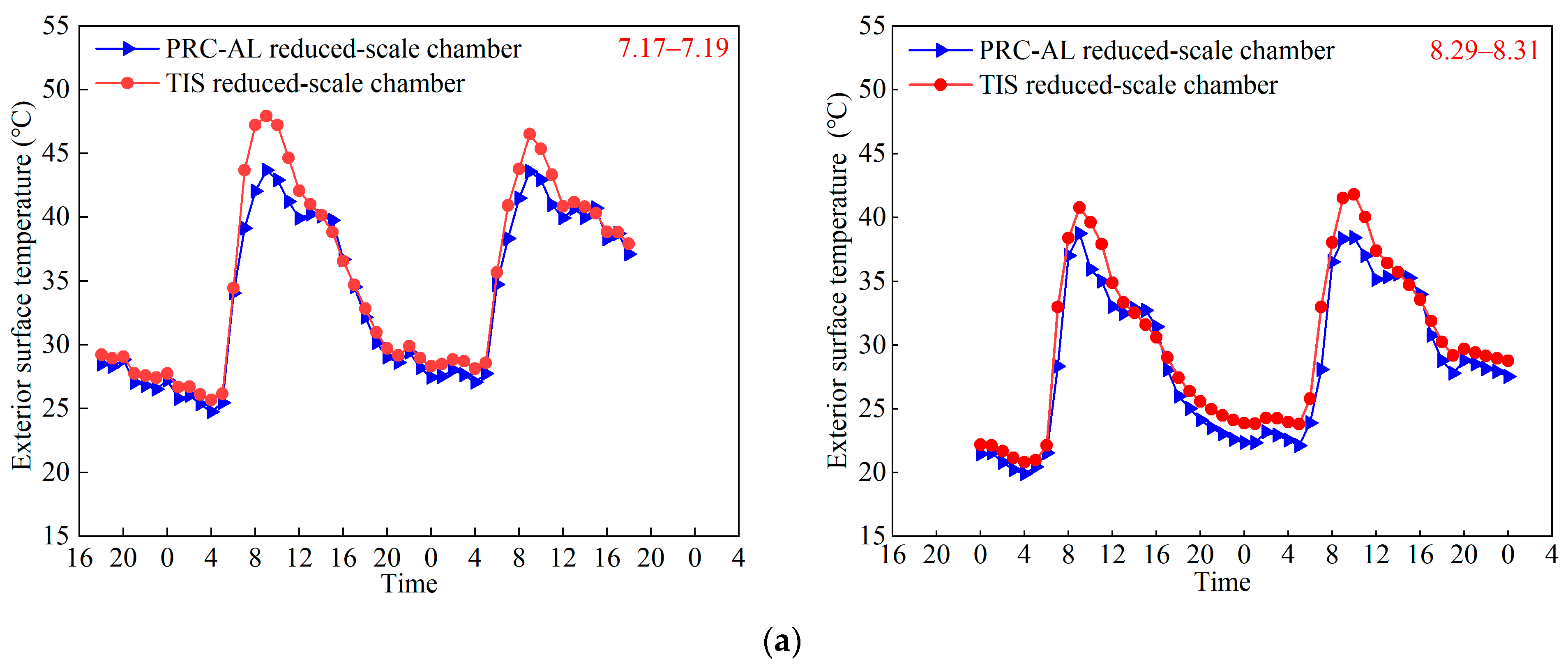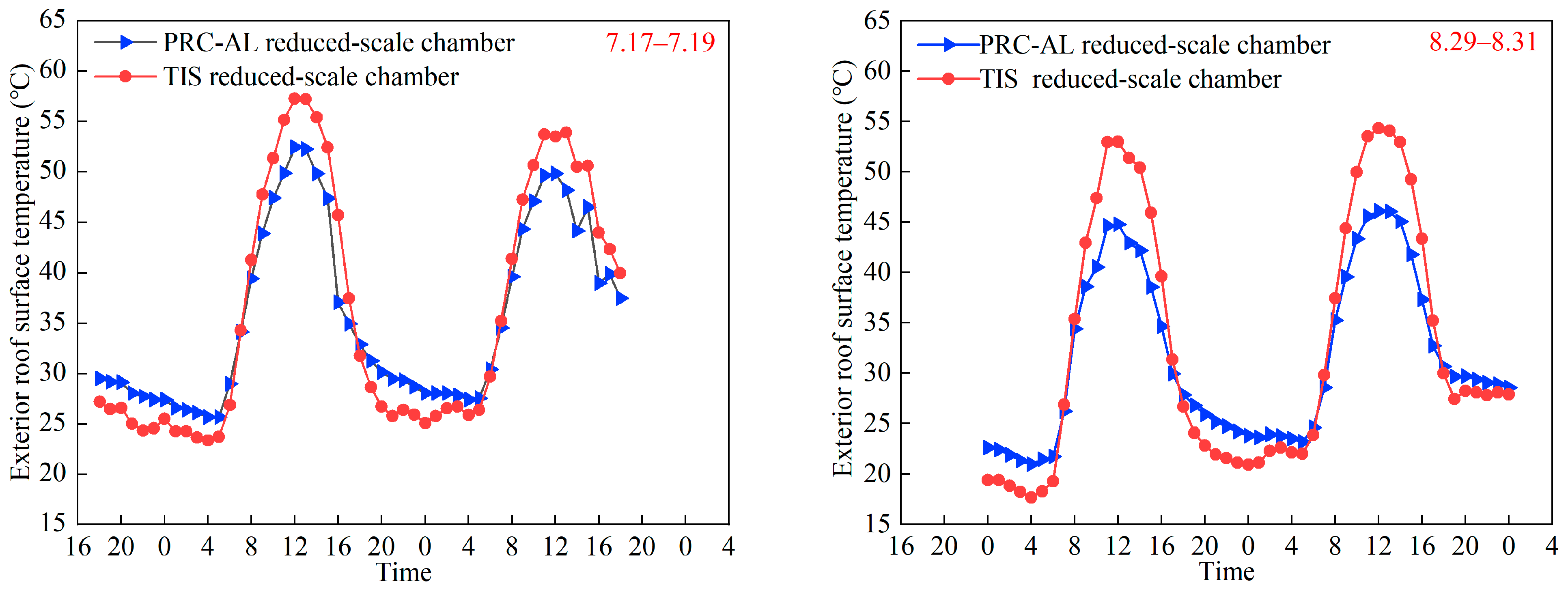 - Under the summer condition without internal heat sources, the exterior roof surface temperature of the PRC-AL reduced-scale chamber exhibited a maximum temperature reduction of 8.6 °C compared with the TIS reduced-scale chamber. This demonstrates that the radiative cooling material exhibits significant passive daytime radiative cooling performance. Meanwhile, the solar radiation intensity received by the walls of different orientations varies with time, leading to a clear trend that changes over time in the exterior wall surface temperature. The daily average temperature difference between the roofs of the two chambers is greater than that of the walls.