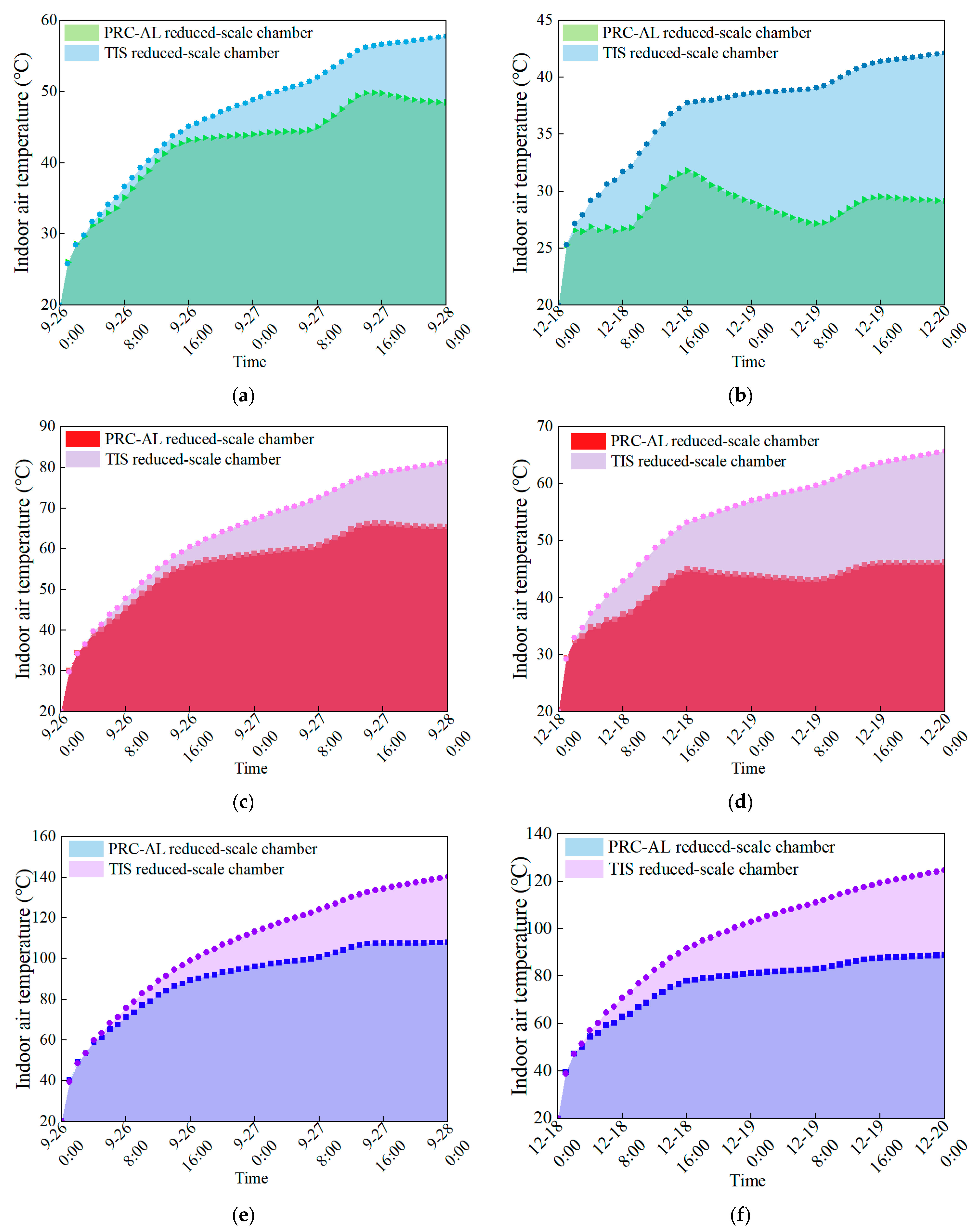 - Under the condition of an internal heat source power density of 300–1000 W/m2 without a cooling system, the indoor air temperature of the PRC-AL reduced-scale chamber can be reduced by 9.34 °C to 35.66 °C. As the power density of the internal heat sources increases, the cooling performance of the PRC-AL composite envelope structure improves correspondingly. At the same time, the temperature reduction in winter is greater than that in the transition season, indicating that the lower the ambient temperature, the more obvious the superiority of the PRC-AL composite envelope structure. It can be proved that PRC-AL composite envelope structure effectively reduces both the indoor air temperature and the cooling load, making it a viable option for energy saving in data center rooms.