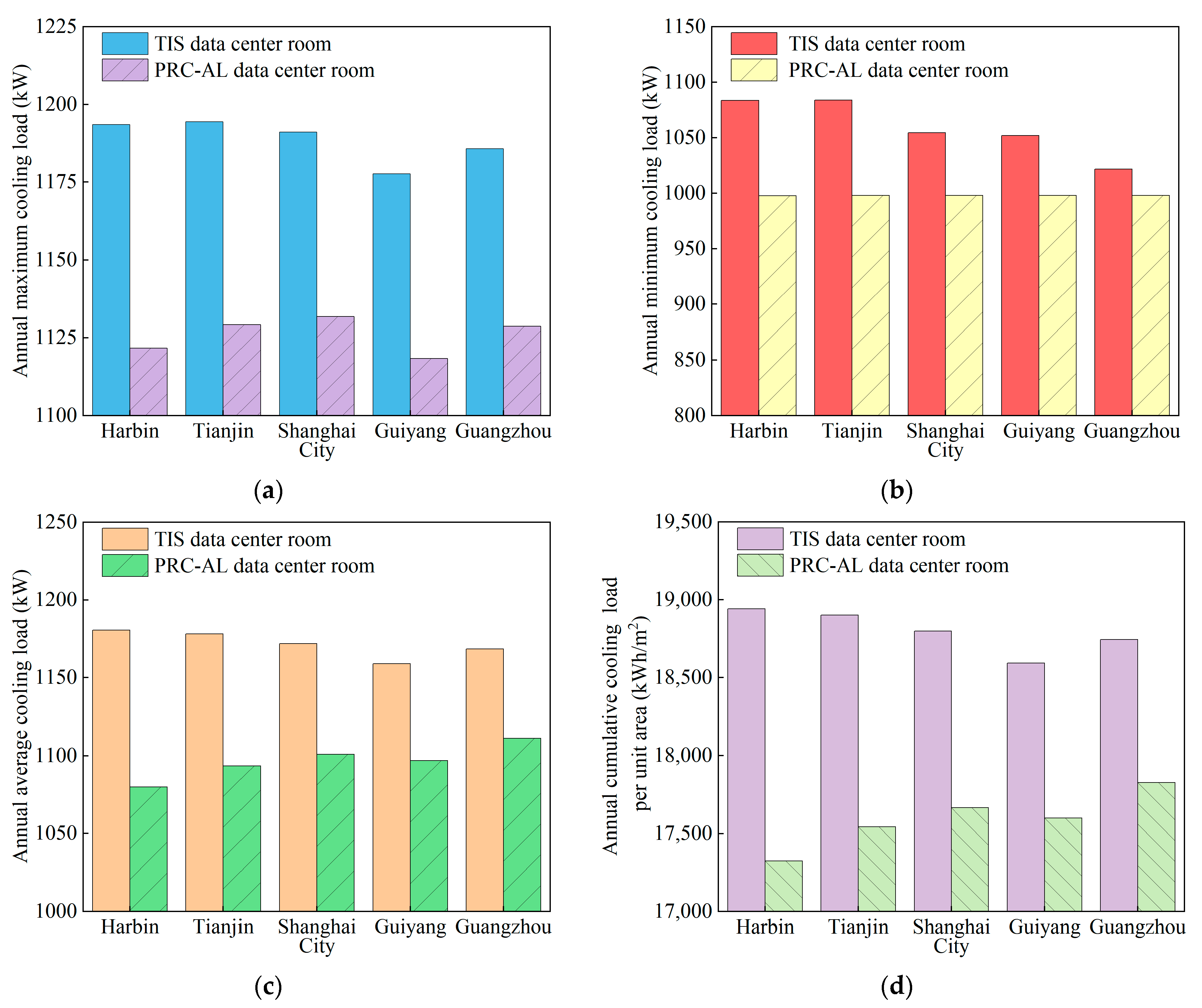 - The energy-saving performance of the PRC-AL composite envelope structure depends on the weather conditions and the surface properties of radiative cooling materials. The PRC-AL composite envelope structure significantly reduces the cooling load of the data center rooms. The application of PRC-AL composite envelope structure has led to a decrease in the annual cumulative cooling load per unit area of 1617.69 kWh/m2 in Harbin, 1359.49 kWh/m2 in Tianjin, 1135.25 kWh/m2 in Shanghai, 994.97 kWh/m2 in Guiyang, and 918.70 kWh/m2 in Guangzhou. These results demonstrate that the energy-saving rates of the PRC-AL data center room increase with latitude. Therefore, compared with the TIS, the PRC-AL composite envelope structure shows a good energy-saving effect in five different climatic conditions. The implementation of the PRC-AL data center room is proposed in the severe cold zone and the cold zone of China.