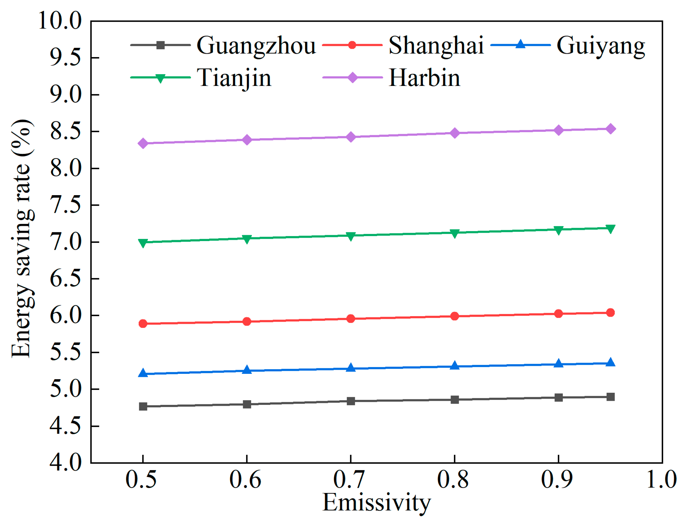 4.4.3. Effect of the Emissivity on the Energy Saving