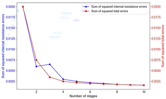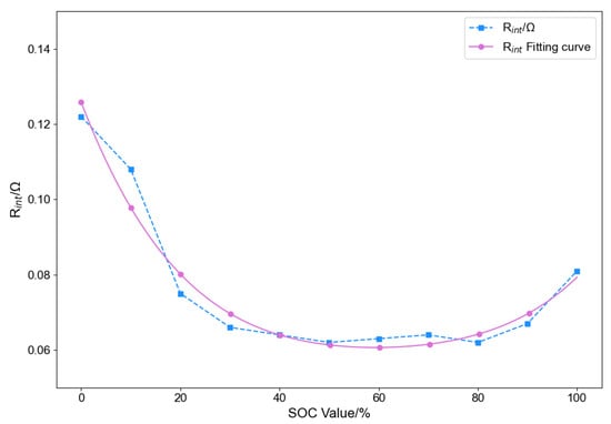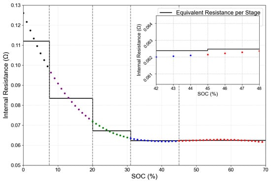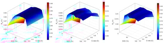 where , , and are the average values of the ohmic internal resistance and the polarization internal resistances, respectively. The fitting results for the battery’s internal resistance are shown in Figure 2.