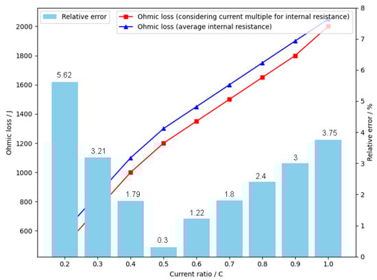 Figure 3 juxtaposes the ohmic losses calculated under 0.2 C–1 C constant current settings utilizing two distinct resistance values: the mean internal resistance and the C–rate–dependent resistance. The findings demonstrate that both computed loss values rise consistently with the C–rate. At the 0.2 C rate, the relative inaccuracy of the averaging approach attains 5.62%. Consequently, the charging current is limited to the range of 0.3 C to 1 C. The average relative error of the ohmic loss calculated using the averaging method within this range is 2.18%.