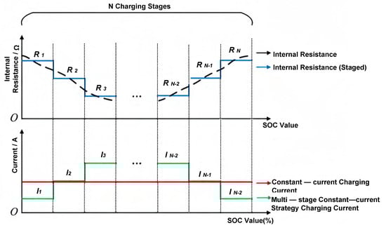 The SMCC charging strategy seeks to enhance the charging efficiency of lithium–ion batteries [19], specifically by staging the process according to the SOC [20]. This technique segments the charging process into several constant current phases. Figure 4 exemplifies the constant current charging phase of the conventional CC–CV method. The charging current at each phase demonstrates an inverse relationship with the battery’s internal resistance. This feature efficiently minimizes energy loss during charging without prolonging the total charging time.