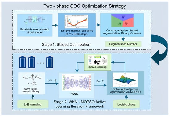 The two–stage charging method is based on adaptive SOC partitioning. It incorporates staged optimization and an iterative framework combining WNN with MOPSO and active learning. The concrete process is detailed in Figure 5. At the initial stage of optimization, an advanced hybrid clustering algorithm integrating the canopy and bisecting K–means methods is applied to improve the partitioning of charging data. The hybrid clustering algorithm dynamically determines the number of charging phases and the staging methods based on the distribution characteristics of internal resistance with respect to the SOC curve. This method produces the SOC staging results. The second optimization phase employs the results of SOC staging along with the established parameters of the battery equivalent circuit model to compute the optimal operating currents. This is achieved by a closed–loop active learning system that combines a WNN with a multi–strategy enhanced MOPSO algorithm.