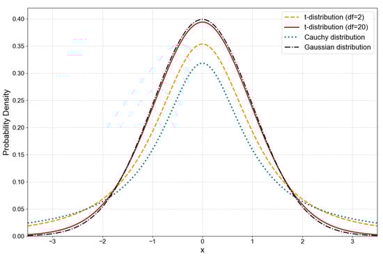 In the equation, denotes the particle’s current position, and the outcome of the operation yields the new position upon mutation. The variable is a random variable that adheres to a t–distribution, with the iteration number k representing its degrees of freedom.