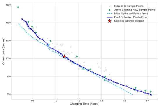 This section seeks to optimize the charging current for each segment, according to the defined SOC phase framework. The objective is to achieve a balanced, multi-dimensional minimization of charging time T and resistive loss . Traditional optimization methods rely on extensive, time–consuming physical testing and struggle to accurately depict the nonlinear characteristics of the battery. A synergistic framework consisting of data sampling, WNN modeling, multi–objective particle swarm optimization (MOPSO), and active learning iteration was established to address this issue. The exact technique is as follows: