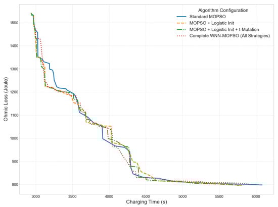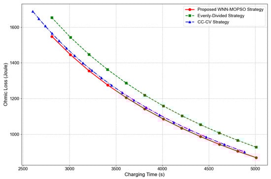 Figure 15 illustrates a comparison of the Pareto fronts for three techniques, with charging time and ohmic loss as the primary evaluation criteria. The strategies include the WNN–MOPSO optimization strategy, the CC–CV method, and the equal-division multi–phase constant current strategy. Their performance curves encompass a charging time interval from 2600 s to 5100 s and an ohmic loss range from 900 joules to 1700 joules. All three illustrate the inverse relationship between charging time and ohmic loss. Extending the charging time by reducing the current density helps reduce ohmic loss. The Pareto front of the WNN–MOPSO optimization technique exhibits dominance throughout the whole spectrum. The associated ohmic loss for any specified charging time is inferior to that of the other two solutions, hence affirming its superiority in reconciling “rapid charging” with “minimal loss.” The efficacy of the CC–CV method is average. The equal–division multi-phase constant current method demonstrates the greatest ohmic loss, underscoring its constraints.