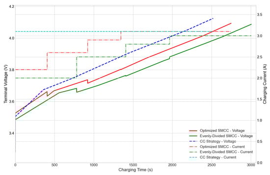 The SMCC charging strategy uses SOC as the switching condition and can better accommodate the dynamic changes in internal resistance with SOC [2]. Compared with the CC–CV and VMCC strategies, its core advantage lies in its direct correlation with the battery’s internal electrochemical state, rather than relying solely on externally measurable terminal voltage signals. This gives the strategy stronger adaptability.