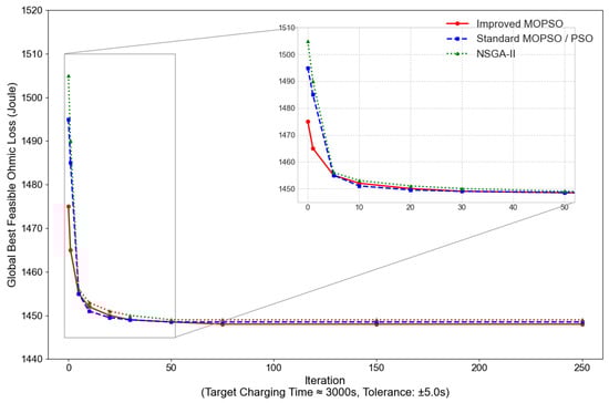 Convergence process comparison between MOPSO and non-dominated sorting genetic algorithm II (NSGA-II) for minimizing ohmic loss at a 3000s charging time.