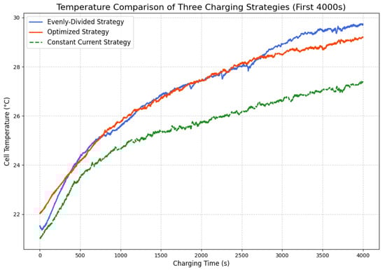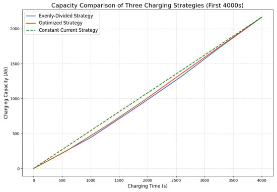 To ensure a fair performance comparison among the adaptive segmentation–WNN–MOPSO strategy, the uniform SMCC strategy, and the conventional CC strategy, it is essential to verify the consistency of task completion under the same charging duration constraint. The experiment set a fixed charging duration of 4000 s. Figure 17 presents the charging capacity curves of the three strategies, visually showing their task completion. The key value of this result is that it directly confirms the significant improvement in thermal stability shown in Figure 16. This improvement is not achieved by compromising charging speed or reducing charging capacity. Instead, it stems from precise regulation of the charging current profile by the optimization strategy. Using canopy–bisecting K–means clustering for adaptive SOC segmentation, combined with accurate fitting of nonlinear charging relationships by the WNN model and multi–objective optimization by the MOPSO algorithm, the current allocation dynamically adapts to the variation of battery internal resistance with SOC. This approach maintains charging rate and capacity while suppressing ohmic heat generation and polarization losses at the source, ultimately achieving a coordinated benefit of fast charging, low thermal impact, and high efficiency.