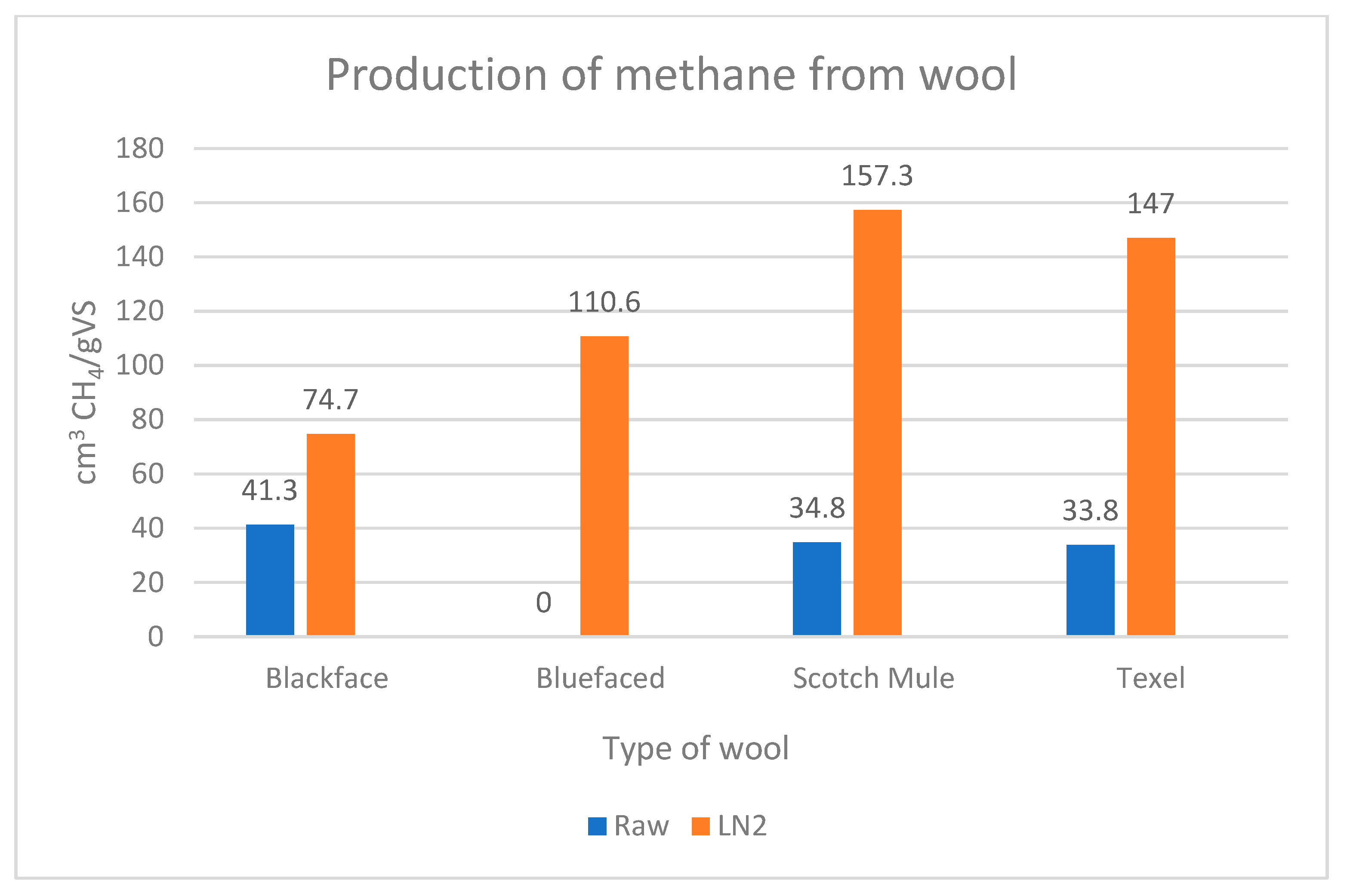 - Kuzmanova, E.; Zhelev, N.; Akunna, J.C. Effect of Liquid Nitrogen Pre-Treatment on Various Types of Wool Waste Fibres for Biogas Production. Heliyon 2018, 4, e00619. [Google Scholar] [CrossRef]
