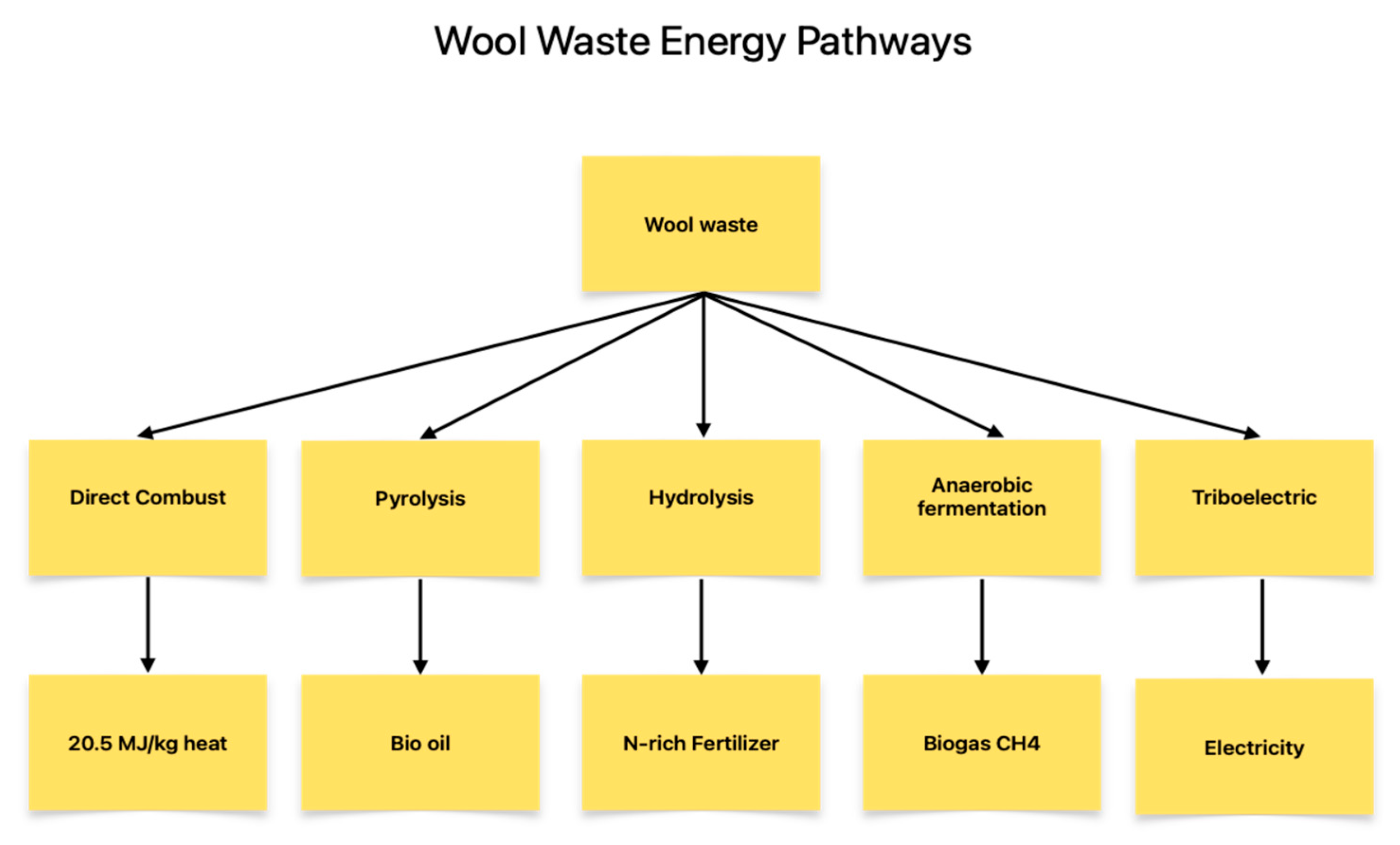 Anaerobic Fermentation [34,44] | Produces biogas (methane) as renewable energy Digestate usable as fertiliser | Wool stability reduces biodegradability without pretreatment Long residence times needed | Moderate (Methane yield varies, example ~0.2–0.3 m3 CH4/kg volatile solids | Pretreatment approaches to disrupt wool structure (chemical, enzymatic) Process efficiency | TRL 4–7 (varies, emerging for wool biomass) |