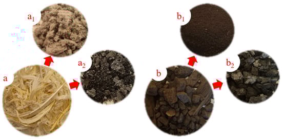Materials analysed. Symbols: “a”—poultry feathers from ducks in the as-received state; “a1”— pulverised poultry feathers; “a2”—char obtained from poultry feathers; “b”—pea-sized lignite in the as-received state; “b1”— pulverised lignite; “b2”—char obtained from lignite.